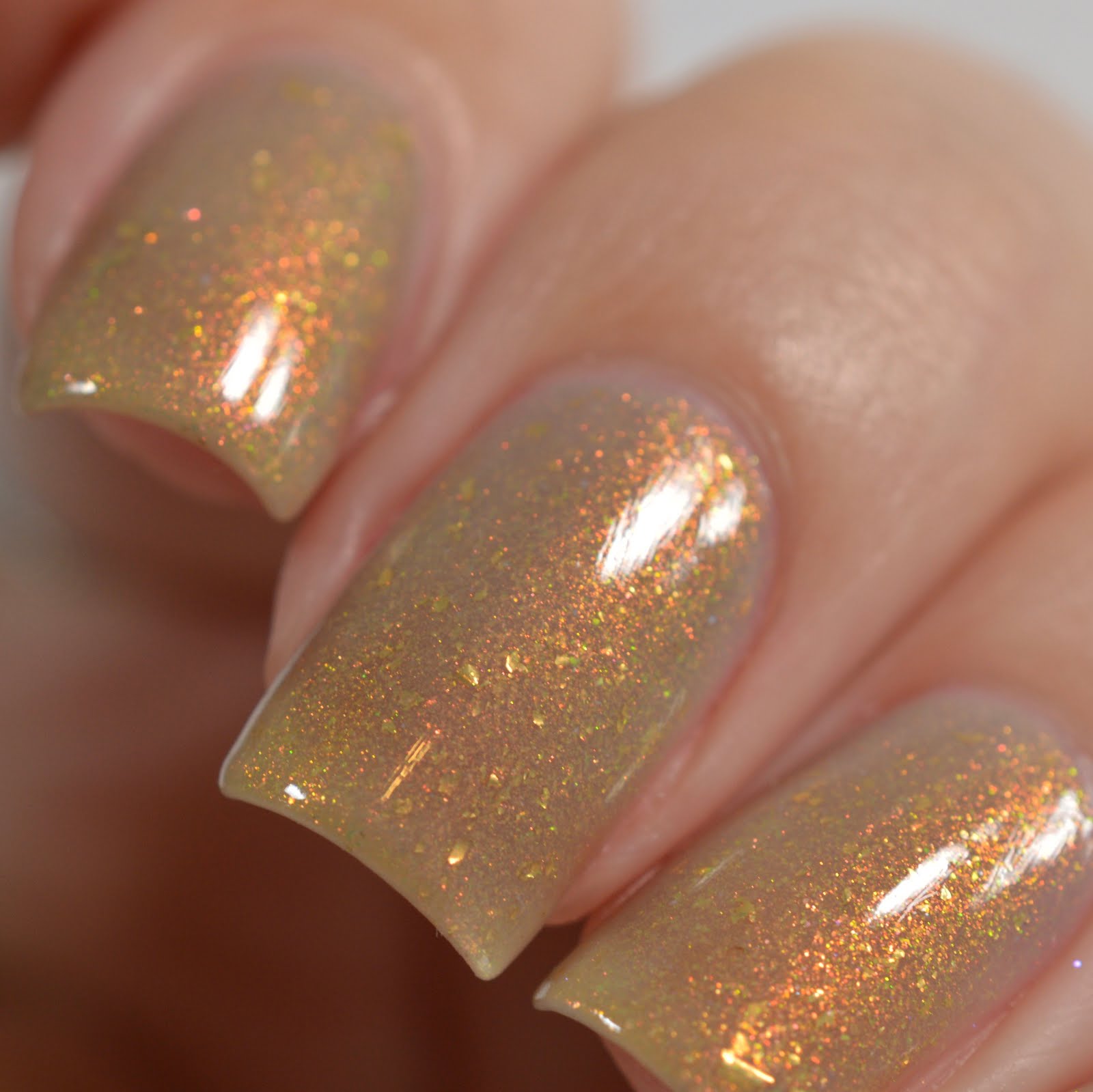 Bel Macchiato is described as a coffee inspired thermal polish that transitions from a glowing semi-sheer neutral with gold microflakes to a rich espresso with copper highlights, red to green shifting aurora and gold microflakes.